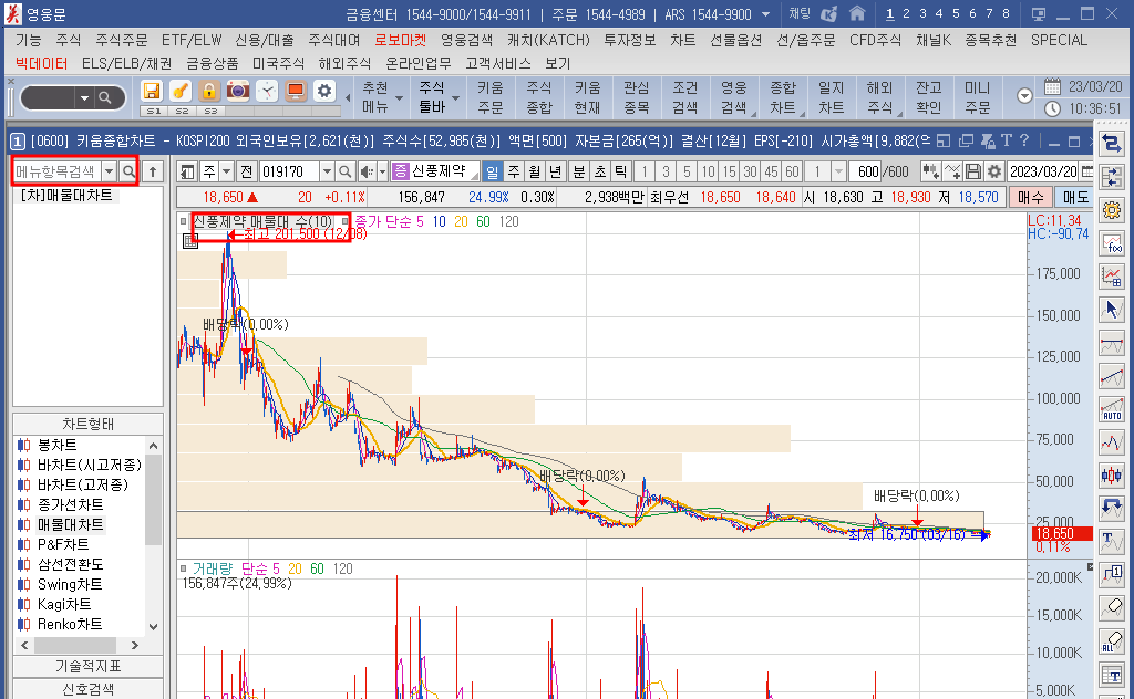 HTS에서 차트 → 종합차트 → 좌측 상단에 매물대라고 검색을 합니다. 검색하고 좌측 중간에 매물대 차트를 설정하시면 끝입니다.